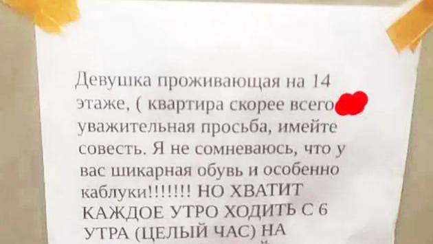 «Девушка, проживающая на 14 этаже, убедительная просьба, имейте совесть. Я не сомневаюсь, что у вас шикарная обувь и особенно каблуки! Но хватит каждое утро с 6:00 целый час на каблуках по всей квартире!» — говорится в сообщении.