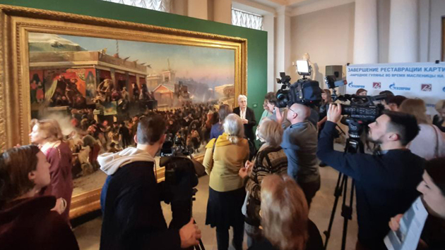 Русский музей представил в среду отреставрированную картину Константина Маковского "Народное гулянье во время масленицы на Адмиралтейской площади в Петербурге". Как подчеркнула в беседе с корреспондентом ТАСС ведущий художник-реставратор высшей категории отдела реставрации станковой масляной живописи Ольга Кленова, работу удалось закончить в очень короткие сроки и успеть к Масленице во многом благодаря современному оснащению музея.