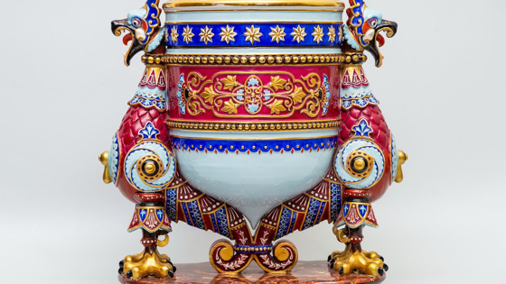 «Кашпо с головами грифонов» в форме богатырского шлема выставили на продажу в Москве, сообщили «Мосленте» в аукционном доме «Русская эмаль». Декоративный сосуд в неорусском стиле был выпущен под заказ в XIX веке на фарфоровом заводе Матвея Кузнецова. По словам организатора торгов «Русской эмали», тираж кашпо составляет не более 40 штук.