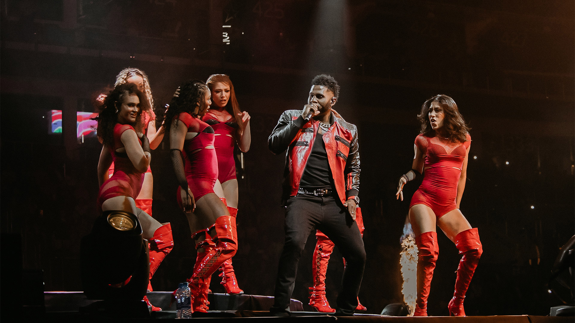 Затем на сцене появился сам Джейсон Деруло. Он эффектно начал своё шоу с песни Swalla. Подтанцовывали ему девушки в коротких красных костюмах. Позже к певцу присоединились и мужчины-танцоры. В каждом номере участвовало около 10 человек, а их движения были направлены в разные стороны круговой сцены, чтобы все в зале могли их увидеть.
