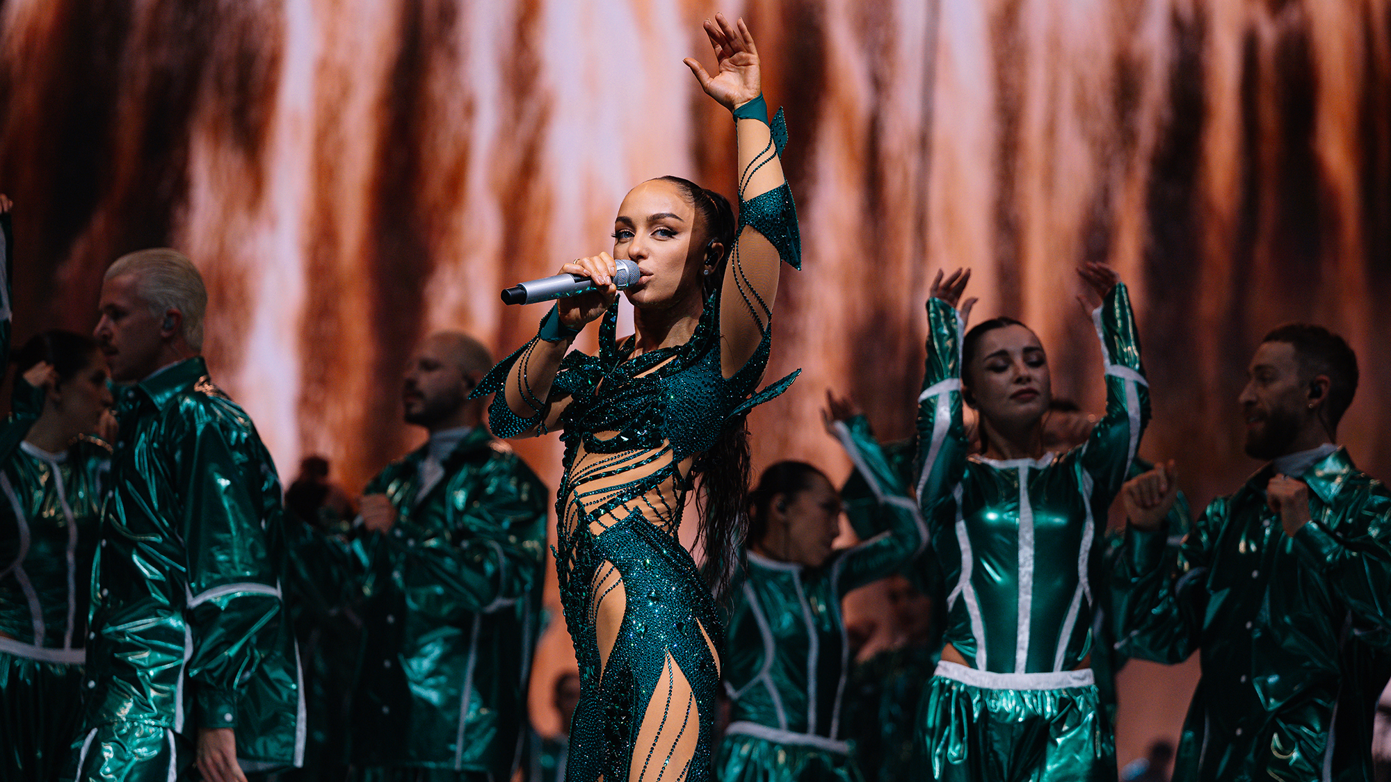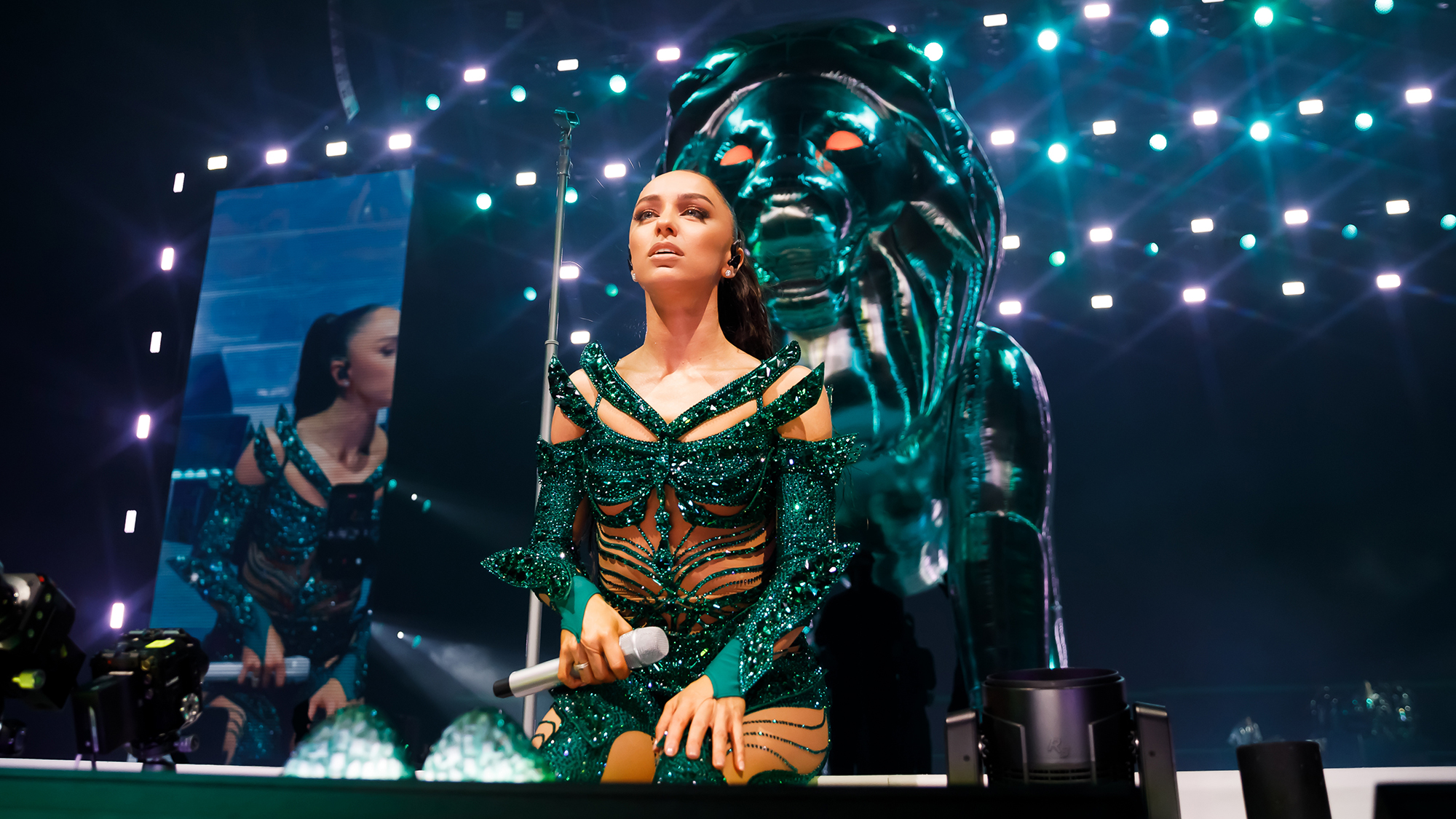 Помимо певицы, на сцене регулярно присутствовала ещё пара десятков танцоров в неизменно блестящих одеждах. Все они действовали как слаженный организм, превращая концерт в вокально-хореографическое шоу. Во время исполнения песни «Конфетти» танцоры и вовсе легли на пол, двигая исключительно ногами и руками. Их движения образовывали различные геометрические фигуры, как если бы вы наблюдали за номером пловцов-синхронистов. Расположенная над ними камера транслировала хореографию на экран — необычное решение выгодно отличало этот номер от остальных.