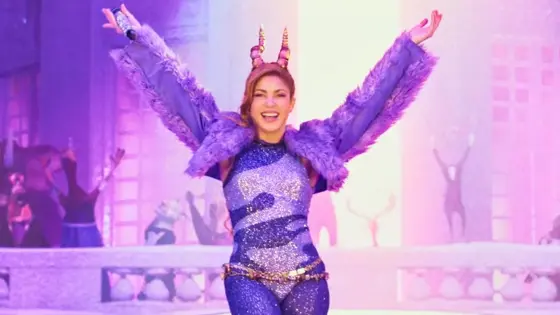 Шакира не только появляется на большой сцене, выступая перед сотней мультяшных зверей, но и едет на поезде и даже взбирается в гору.