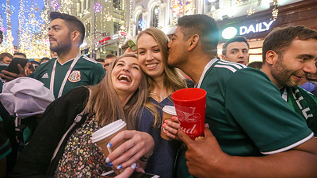 Наш корреспондент прогулялась по "народной фан-зоне" в центре Москвы, расцеловалась с марокканцем, поболела за Тунис, встретила "снегурочку" и сделала с десяток селфи во имя дружбы народов. День: саксофон, водка и сувениры Познакомиться с аргентинцем просто. Достаточно подойти к любому парню в бело-голубой футболке и сказать, что Messi is great. И все — вы почти друзья. "Роналду красивее, но Месси — лучший игрок, — объясняет мне Элизио и показывает на товарища: — Вот он лучше меня играет, а я красивый. Я Роналду, а он — Месси!" В стаканчике у Элизио — пиво, хотя водку он тоже полюбил, но два часа дня — "слишком рано для водки". В этом баре на Никольской почему-то плотно обосновались именно аргентинцы. Днем сюда еще можно безболезненно зайти. Вечером — не протолкнуться. Как говорит менеджер Ирина, выручка выросла раз в пять, зато и работать приходится с девяти утра до двух ночи. "Вечером, бывает, танцуют, — рассказывает она. — На столах прыгают. Нет, они адекватные, но столы на веранде поломали". Официальную фан-зону московские власти устроили на Воробьевых горах. Основная пешеходная улица Москвы — конечно, Арбат. Главная "новинка" последнего времени — парк "Зарядье". Как получилось, что из всех возможных вариантов гости чемпионата стихийно выбрали именно Никольскую улицу, никто толком так и не понял. Да, она в центре, прямо у Красной площади — но мало ли у нас красивых мест в центре. Да, здесь полно кафе и баров — но и на других улицах их тоже достаточно. Возможно, иностранцев привлекли гирлянды, которые кажутся новогодними, но висят на улице до сих пор. А может, просто случайно сюда забрели несколько первых компаний — и пошло-поехало. Так или иначе, "пойти потусоваться на Никольской" для москвичей всех возрастов — это сейчас примерно то же, что "пойти потусоваться на Арбате" для музыкантов с гитарами. Местный бизнес доволен: выручка выросла так, что даже поломанная мебель тут никого не расстроит. "Посетителей всегда было много, но сейчас 90% из них — иностранцы, — говорит Ксения, менеджер другого кафе. — Работаем по 12–15 часов и с одним выходным. Все устали, даже кассиры. Но когда это кончится, будет скучновато". Первые четыре дня пришлось вводить ограничение — столики давали только на полтора часа. Сейчас "днем — лайт, а вечером — опять-таки атака". Такая же толпа — в магазине русских сувениров. Француз сметает с витрины пару десятков магнитов с надписью Moscow. Мексиканец задумчиво рассматривает матрешку с лицом Месси. На все это величественно взирает крупный чернокожий парень. При ближайшем рассмотрении оказывается, что он здесь продавец и вообще семь лет живет в России. Другой продавец, взмокший мужчина в галстуке и жилете, тычет пальцем в портрет российского президента — китайцы не узнали Путина. В двух шагах — другой сувенирный магазин, чуть поменьше, но с такой же толпой. Девушка с Карибов задумчиво смотрит на футболку с Забивакой. "Нравится?" — спрашиваю я по-английски. "Очень, но размер слишком маленький", — огорчается она. Пара пуэрториканцев на вопрос "как вам Москва?" взахлеб рассказывает, что нигде не видели такого красивого метро. А вот в магазине русского шоколада людей почти нет. "У нас с чемпионатом народу меньше стало, — говорит продавец. — Все, наверное, на пиво переключились". Самые шумные на Никольской — мексиканцы. Они по улице даже не хо