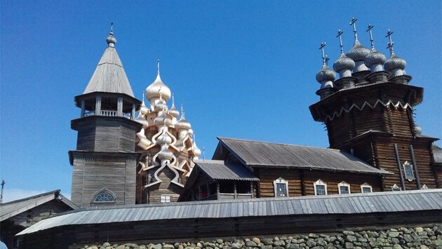 Как сообщает музей-заповедник Кижи, гости праздника традиционно облачаются в исторические костюмы жителей русского Заонежья, специально шьют сарафаны и рубахи. В этом году гостей привечали Трапезой заонежской округи. На общее застолье собрались жители окрестных деревень, потомки знатных родов Заонежья, а в торжественном "меню" были старинные яства – уха, кисель и народные карельские пирожки-калитки, испеченные из ржаной муки, произведённой прямо на заповедном острове. Настоятель Спасо-Преображенского прихода отец Павел Лехмус отслужил Божественную литургию, возглавил Крестный ход округ Кижского погоста и провел освящение плодов нового урожая – в первую очередь яблок, ибо второй Спас издревле зовется яблочным, а заодно репы, тыквы, огурцов и прочих даров родной земли. Ровно через год, 19 августа 2020 года, планируется открытие для верующих церкви Преображения Господня после сорокалетнего перерыва. К этому моменту обещают восстановить интерьер церкви и смонтировать иконостас, некогда слывший одним из самых благолепных на Русском Севере: состоящий из 105 икон в резной золоченой раме. Спасо-Преображенская церковь - самый высокий храм на острове. Фото Е. Сафроновой Многолетняя реставрация Преображенской церкви Кижского погоста в текущем году вошла в завершающую стадию. Как говорят музейные работники, реставрация сруба Преображенской церкви закончится в ближайшем ноябре. Но к началу летнего туристического сезона храм был полностью освобожден от лесов. Именно таким, в первозданной красе, с двадцатью двумя главками, блестящими на солнце, будто железные, я увидела его в конце июля. Двадцать одна глава Спасо-Преображенской церкви симметрично распределены по сторонам света. Двадцать вторая венчает храм. Число "двадцать два", поясняют в музее, не имеет какого-либо подспудного смысла, ни символического, ни священного – это просто изумительное произведение строительного искусства, подобного которому нет в мире. Церкви Преображения Господня на сегодня более трехсот лет. Но она – не самое древнее здание Кижей. Древнейшим дошедшим до нас деревянным строением архипелага считается церковь из Муромского монастыря – не из города Мурома, а из Свято-Успенского монастыря при впадении реки Муромки в Онежское озеро. По ряду внешних признаков и сохранившемуся документу за подписью преподобного Лазаря её относят к XIV веку. Эта крохотная, потемневшая от времени церковь – один из "экспонатов" музея-заповедника, "пришлая" на острове Кижи. Часовня из муромского монастыря - справа у дороги. Фото Е. Сафроновой До 1693 года на месте нынешней Преображенской стояла другая церковь под тем же названием. Облик её история не сохранила – лишь упоминание в писцовых книгах, что на Кижском погосте уже в XVII веке имелись два деревянных храма, которые сгорели в 1693 году в сильную грозу от удара молнией. В начале XVIII столетия была вновь возведена Спасо-Преображенская церковь. Насколько могу судить, такое название храма особенно типично для русского севера. В этом году главному храму Кижского погоста, Преображенскому, "исполнилось" 305 лет. Это рукотворное чудо высокой степени технической сложности: по официальным данным, только восьмигранный сруб храма состоит из 2550 бревен, а ведь есть еще и элементы интерьера!.. Если выложить брёвна, из которых сделана церковь, в ряд