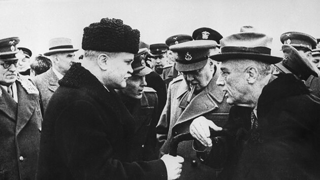 В феврале 1945 года, когда западные союзники подходили к берегам Рейна, Советы взяли Будапешт, а японцы потеряли Манилу, Гитлер изучал модели переустройства своего родного города Линца, который он планировал переделать после победы в войне. Его надежда на победоносное завершение войны перед лицом неминуемого уничтожения зиждилась на двух факторах. Фактор первый — это супероружие, которое разрабатывали немцы: реактивные самолеты, баллистические ракеты (в 1944 и 1945 годах по Британии было выпущено 1 050 «Фау-2») и суперсубмарины. Фактор второй — уверенность в том, что по мере сближения друг с другом союзники, у которых были очень разные интересы, непременно вступят в драку. Союзники, со своей стороны, были твердо намерены не допустить этого. Одна из слабо освещенных историй той войны — это история постоянных дипломатических усилий союзников, в рамках которых высокопоставленные руководители совершали опасные трансконтинентальные полеты, дабы убедиться, что никто из них не выйдет из игры. Больше всех путешествовал Уинстон Черчилль, который в общем провел за пределами Британии целый год. Однако «Большая тройка» в лице руководителей США, Советского Союза и Великобритании встречалась всего один раз в конце 1943 года на конференции в Тегеране, когда разгром союзников (что бы ни воображал Гитлер) был уже невозможен, однако контуры победы были совершенно неясны. Но к началу 1945 года назрела необходимость проведения саммита по установлению послевоенного миропорядка. Сталин был в Тегеране, но он ненавидел летать. Его дипломаты предложили провести совещание в Крыму, так как зимой там не очень холодно. Черчилль выступил со встречным предложением о проведении саммита в Иерусалиме. Однако Сталин сказал, что он слишком слаб здоровьем и не сможет предпринять такое путешествие. Поэтому в самый дальний путь пришлось отправиться тому, кто действительно был серьезно болен — Франклину Рузвельту. Ялтинская (Крымская) конференция Это было опасное путешествие, о чем пишет Диана Престон (Diana Preston) в своей книге «Восемь дней в Ялте» (Eight Days at Yalta). Рузвельт и Черчилль добрались до Мальты кораблем, а оттуда полетели в сторону Черного моря, держась в стороне от Крита, где еще были немцы. Один самолет, отправленный заранее в пробный полет, не вернулся из него. Совершив посадку на аэродроме, лидеры двух стран еще три часа ехали по разбитым дорогам в Ялту мимо разрушенных домов, сожженных танков и бронемашин. Сталин большую часть пути проделал на бронепоезде. Крым был освобожден от нацистов всего за десять месяцев до конференции. Полуостров был полностью разрушен, и восстановить его еще не успели. Ялта была довольно милым курортным местечком с приятным микроклиматом. Именно поэтому здесь предпочитал жить Чехов. По этой же причине русские цари и их придворные возводили там роскошные дворцы для отдыха. Три таких дворца, Ливадийский, Воронцовский и Юсуповский, спешно подлатали. Туда привезли мебель и персонал из остатков лучших московских гостиниц и разместили в этих дворцах американскую, британскую и советскую делегации, соответственно. Три лидера являли собой полный контраст друг другу. Рузвельт был внешне весьма дружелюбен и учтив, однако загадочен и малопонятен, этакий первый среди равных. Но он умирал, и жить ему оставалось всего три месяца. Черчилль был смел,
