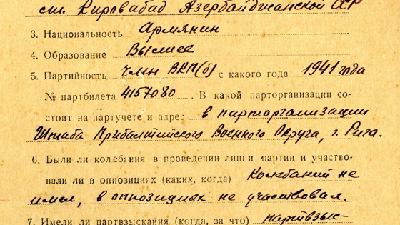 Пользователи «МЭШ» могут ознакомиться с документами Маршала Советского Союза Ивана Христофоровича Баграмяна (1897–1982). Среди них – автобиография военачальника, составленная в 1948 году и заверенная его подписью, а также учетная карточка Героя Советского Союза И.Х. Баграмяна. (Подобные карточки составлялись в Московском институте истории партии при создании в первые послевоенные годы коллекции документов о Героях Советского Союза.) Это высокое звание было присвоено прославленному полководцу дважды: 29 июля 1944 года командующий 1-м Прибалтийским фронтом генерал армии И.Х. Баграмян был награжден за выдающиеся результаты, достигнутые войсками фронта в Белорусской наступательной операции «Багратион», и проявленное личное мужество. А 1 декабря 1977 года Маршал Советского Союза Баграмян удостоился второй медали «Золотая Звезда» и ордена Ленина за заслуги перед Вооруженными Силами СССР, мужество и героизм, проявленные в борьбе с немецко-фашистскими захватчиками. 13 мая 2003 года именем Маршала Баграмяна названа улица, расположенная в Юго-Восточном административном округе Москвы, на территории района Люблино. Также опубликована автобиография генерала армии, дважды Героя Советского Союза Афанасия Павлантьевича Белобородова (1903–1990). 22 июля 1944 года он был награжден медалью «Золотая Звезда» за боевые заслуги и умелое командование войсками в Витебской операции. Второй раз звание Героя Советского Союза Белобородову присвоили 19 апреля 1945 года – за героизм и мужество, проявленные при штурме Кёнигсберга. 21 февраля 1995 года именем Генерала Белобородова названа улица в Северо-Западном административном округе Москвы, на территории района Митино. В электронной библиотеке «МЭШ» доступны письма сослуживцев летчика-штурмовика, гвардии старшего лейтенанта Сергея Васильевича Милашенкова (1921–1944) родным героя. 14 июля 1944 года в районе украинского села Микуличи его самолет был подбит во время выполнения боевого задания, но пилот направил горящую машину на автоколонну противника. 27 июня 1945 года С.В. Милашенкову присвоили звание Героя Советского Союза (посмертно) за 90 успешных боевых вылетов и проявленные мужество, героизм и личную отвагу. 23 января 1964 года именем Милашенкова названа улица в Северо-Восточном административном округе Москвы (Бутырский район). На портале также доступны документы гвардии генерал-майора Василия Аскалепова, полковника Петра Брайко, подполковника Ивана Мишина, капитана Вячеслава Балашова, старшего лейтенанта Геннадия Александрова, лейтенанта Алексея Алиевского, гвардии сержанта Константина Амзина и других Героев Советского Союза. Работа над совместным проектом Главархива Москвы и Департамента образования и науки города Москвы «Герои Советского Союза – наследникам Победы» началась в апреле 2019 года. Проект включает в себя биографические материалы более1200 героев, которым в разные годы было присвоено это высокое звание, прежде всего – участников Великой Отечественной войны. Проект планируется реализовать в полном объеме к 75-летию Великой Победы. Уже сегодня пользователям Московской электронной школы доступно более 1260 архивных документов о 289 Героях Советского Союза. В процессе подготовки материалов к публикации московскими архивистами было изучено свыше 10 тысяч листов архивных документов. На электронном ресу