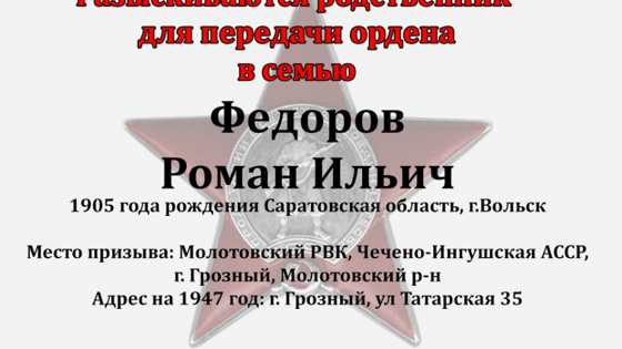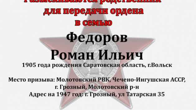Поисковый отряд «БУМЕРАНГ - ДОСААФ» просит оказать помощь в поиске родственников Федорова Романа Ильича – красноармейца, стрелка 1-го стрелкового полка 191-й стрелковой дивизии для передачи ордена «Красная Звезда» в семью героя! В газету «Центр города Наро-Фоминск» обратился неравнодушный житель Наро-Фоминска, которым был найден орден «Красная Звезда» № 2596029. По архивной справке из ЦАМО стало известно, что орденом был награжден Федоров Роман Ильич 1905 г. р. уроженец г. Вольск Саратовской области. До войны проживал в г. Грозный. Призван на фронт Молотовским РВК Чечено-Ингушской АССР г. Грозный. На 1947 год адрес проживания г. Грозный, ул. Татарская 35. Федоров Роман Ильич был награжден Фронтовым приказом № 388 От: 20.04.1945 Издан: ВС 2 Белорусского фронта. Если кто-нибудь обладает информацией о родственниках Федорова Романа Ильича, пишите на почту boomerang.dosaaf.nf@gmail.com, а также звоните по телефону 8 (906) 706-51-46. Источник: поисковый отряд «БУМЕРАНГ - ДОСААФ»