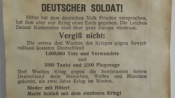 У Великой Победы всегда много авторов. Кто-то считает, что решающий вклад в разгром фашистов внесла боевая авиация – «сталинские соколы». Кто-то голосует за танковые войска, легендарные Т-34. Ну, а кто-то уверен, что залог победы кроется в агитационной работе идеологов той поры. Которая открывала глаза вражеским солдатам благодаря советским листовкам в их окопы. «МК» проследил историю схватки на «листовках» в период Великой Отечественной войны. Но первая советская военная листовка, предназначенная для деморализации войск противника, появилась не в июне 1941 года, как можно было бы ожидать, а в 1938-39 г.г., когда Красная Армия билась с японцами на озере Хасан и реке Халхин-Гол. Естественно, она была на японском языке и говорила вражеским солдатам правду и о японском милитаризме, и о том, что генералы просто их используют как пушечное мясо. «Война нужна только генералам и богачам!» В те далекие годы идея разложить противника изнутри родилась после того, как в распоряжении наших боевых частей оказался агитпоезд 1-й отдельной Краснознаменной дивизии. Где имелась своя маленькая типография и шрифты на японском, китайском и корейском языках. Впрочем, современники признавались, что эффект от той пропаганды был совсем низкий. Что называется, первый блин пошел комом. Имелись определенные трудности с составлением текстов. Да и с переводами на японский язык — тоже, согласитесь, не самые простые в мире иероглифы. В общем, получалось так, что листовки в тыл врага доставлялись с большим опозданием, часто уже после того, как сражение, к которому готовились красноармейцы, состоялось. Из 60 тысяч японских солдат на реке Халхин-Гол пленить удалось только 90, и из них всего четверо сдались в плен добровольно, поверив большевистской пропаганде. В дальнейшем идеологическое мастерство оттачивалось на финском фронте 1939-40 г.г. Но также без особого результата. В те годы считалось, что играть нужно на классовых противоречиях простых солдат и их командиров, представителей буржуазного сословия. Тогда как в той же Финляндии не было резких различий между богатыми и бедными. 27 июня 1941 года, спустя пять дней после начала Великой Отечественной войны, была составлена первая советская листовка «К немецким солдатам!» Она призывала солдат Вермахта кончать бессмысленную войну и переходить на сторону Красной армии. Два дня ранее в Москве было организовано Советское бюро военно-политической пропаганды, под эгидой которого в грозные военные годы и печатались все агитационные материалы. Из них 80 % в стан врага доставлялись с помощью военной авиации, остальное количество распространяли партизанские отряды, подпольщики, в войсках использовались и специальные артиллеристские средства, которые поливали немецкие окопы не металлом и шрапнелью, а листовками. В открытых источниках сообщается, что в первый год войны на головы немецких солдат обрушилось более 650 млн. листовок! Они призывали гитлеровцев «очнуться», начать «бороться за общее правое дело». В общем, повторялась история со сражениями на Халхин-Голе и на финском фронте. Без учета реальных настроений в армии противника. Первый год войны показал, что авторы листовок неправильно расставляли акценты. Они взывали к классовой сознательности немецкого народа, одурманенного фашистской пропагандой, к солидарности пролетари