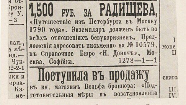 Аукционный дом "Литфонд" 21 мая проведет онлайн-аукцион на платформе Bidspirit. В числе лотов редкие романы Александра Радищева "Путешествие из Петербурга в Москву" на немецком языке, и "История государства российского" Николая Карамзина. Всего на продажу выставлены более 300 лотов редких книг, автографов, исторических бумаг суммой около 20 миллионов рублей. Среди них также полный комплект номеров еженедельной литературной газеты "Фигаро". Также аукционный дом обращает внимание на роман Николая Лопатина "Чума" 1908 года, так как действия в нем разворачиваются во время эпидемии в Москве. Большую ценность также придает и тот факт, что после выхода из печати на роман был наложен арест.