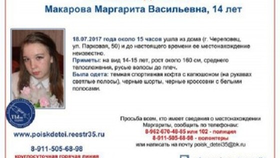 В Череповце ищут пропавшую девочку-подростка, сообщает вологодский поисково-спасательный отряд Ты не один. По информации волонтеров, 14-летняя Маргарита Макарова ушла из дома на улице Парковой, 50 во вторник, 18 июля, около трех часов дня, с тех пор о ней нет никаких известий. Приметы пропавшей: на вид 14-15 лет, рост около 160 см, среднего телосложения, волосы русые до плеч. Была одета в темную спортивную кофту с капюшоном со светлыми полосами на рукавах, черные шорты и черные кроссовки с белыми полосками. Всех, кому что-то известно о судьбе Маргариты, просят позвонить по телефонам полиции: 8962-670-48-85 или 102, либо по горячей линии волонтеров ПСО: 8911-505-68-98. Олег Нечаев