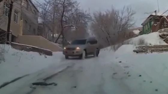 Молодой человек ехал вверх по склону, когда сверху на него полетела серебристая Toyota Land Cruiser. Машину так занесло, что внедорожник несколько раз развернулся вокруг своей оси и продолжил ехать в неуправляемом заносе, а водителю оставалось выкручиваться во всех смыслах слова.