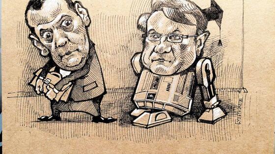 Карикатурист Sobesednik.ru – о расхождениях Дмитрия Медведева и Германа Грефа во взглядах на будущее работников-роботов. Дмитрий Медведев заявил на открытии VIII Петербургского международного юридического форума, что работа юристов – искусство и поэтому роботы их заменить не смогут. Интересно, что думает по этому поводу глава Сбербанка Герман Греф, который ранее рассказывал всем про свою банковскую нейросеть, которая, по его словам, готовит исковые заявления лучше любой юридической службы. * * * Материал вышел в издании «Собеседник» №19-2018.