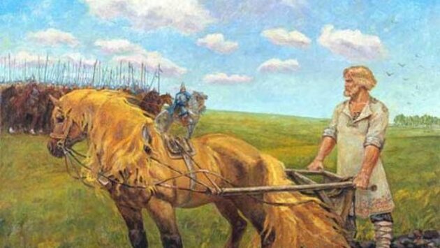 Встречается в двух былинах: о Святогоре и о Вольге Святославиче. Микула берет даже не силой, а выносливостью. Он – первый представитель земледельческого быта, могучий крестьянин-пахарь. Страшная его сила, сопоставление со Святогором указывают на то, что этот образ сложился под влиянием мифов о титанических существах, бывших, вероятно, олицетворением земли или бога-покровителя земледелия. Но сам Микула Селянинович уже представляет не стихию земли, а идею оседлой земледельческой жизни, в которую он вкладывает свою огромную силу.