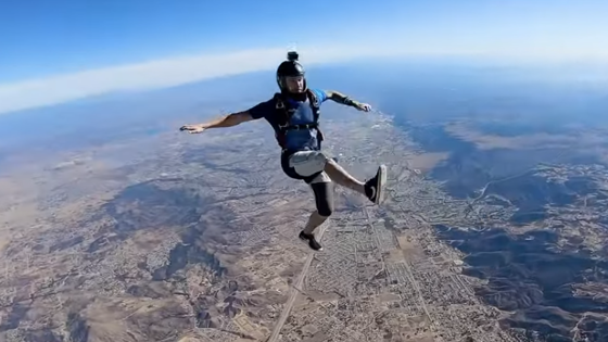 На видео попали «шаги» экстремала по воздуху. Разнообразные трюки показал 29-летни скайдайвер Хэмиш Бриссет. Хэмиш уже проделывал подобное, однако впервые его «воздушная походка» была запечатлена на камеру. Экстремал спрыгнул с самолёта и, будучи в свободном падении, изобразил, будто ходит по небесам. Снимала шоу его супруга, которая также увлекается прыжками с парашютом. Ежегодно парочка любителей острых ощущений совершает около 50 прыжков.