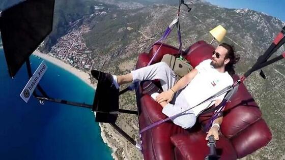 На видео попал мужчина, летевший по небу на диване. Им оказался парапланерист из Турции Хасан Кавал. Мужчина давно мечтал совершить полёт с комфортом и сам создал для себя летательный аппарат. Стартовал Хасан из города Фетхие и приземлился на одном из турецких пляжей. Несмотря на то, что выглядел полёт экзотично, он завершился благополучно.