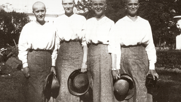 На фотографии Ольга, Татьяна, Анастасия и Мария позируют после стрижки. Кадр сделан в парке Александровского дворца, который заметен на заднем фоне.