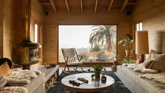 Одноэтажный дом площадью 179,7 квадратных метра, построенный в 1982 году, недавно капитально отремонтировал предыдущий хозяин. В нем есть три спальни и две ванных комнаты, гостиная с дровяной печью, кухня, совмещенная со столовой, а также стол для игры в настольный теннис. Другой особенностью объекта служит наличие деревянных потолочных балок. Из больших окон открывается вид на национальный лес Анхелес и горы Сан-Габриэль.