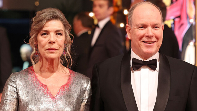 Князь появился на публике в классическом смокинге с галстуком-бабочкой, в то время как его сестра выбрала для вечера серебристое вечернее платье с малиновой оторочкой.
