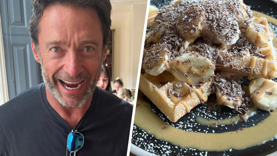 На снимках можно увидеть блюда, которые съел 54-летний Джекман, — бельгийские вафли с дикими грибами, сырным соусом и соусом «Болоньезе» и десертные вафли со сливочной карамелью, бананом и тертым шоколадом.