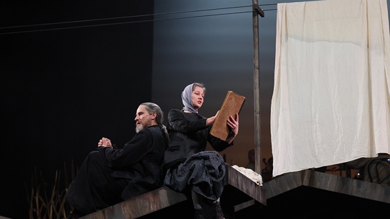 У главного героя лесковского романа, протоиерея Савелия Туберозова, в дневнике мелькнула поговорка: "Укатали Сивку крутые горки". Чем вдохновлялись Агуреева с художницей Марией Митрофановой, гадать не будем. Но актеры сами называют эту сценографию "агуреевскими горками". По этим горкам герои Лескова скачут два с лишним часа. А исполнитель главной роли Савелия - Илья Шакунов еще и носит по этим опасным склонам свою жену, попадью Наталью, которую играет сама Агуреева.