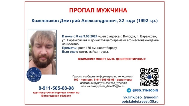 Вологжане, которые обладают информацией о Дмитрии Кожевникове, могут передать сведения по телефонам: 8 911 505-68-98 и 102.