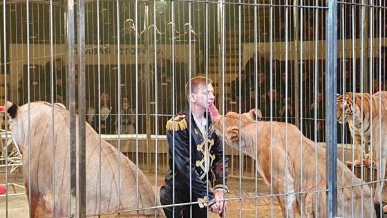 На огороженном решеткой манеже опасность, кажется, ощущается на физическом уровне. Напряжение будто разлито в воздухе. В лучах прожекторов по огромной клетке с угрожающей грацией передвигаются в поисках жертвы львицы и тигры, и нет никакого сомнения: по ту сторону решетки - верная смерть. Публика с ужасом смотрит на клыки крупных зверюг. Но вот в клетку бесстрашно входит дрессировщик в костюме-мундире с золотыми эполетами, и происходит чудо. Свирепые хищник вдруг превращаются в послушных котят. По команде занимают места на тумбах, катаются по манежу, играют в чехарду, перескакивая друг через друга, прыгают через горящее кольцо, ходят на задних лапках, что, кстати, невообразимо для львиц, но здесь - ходят. И даже аккуратно берут мясо изо рта и с шеи дрессировщика.