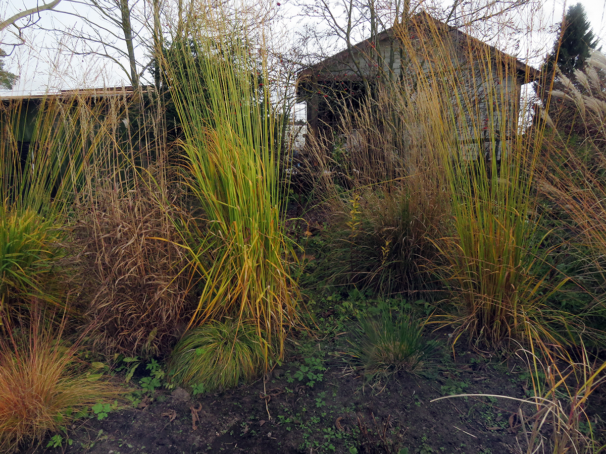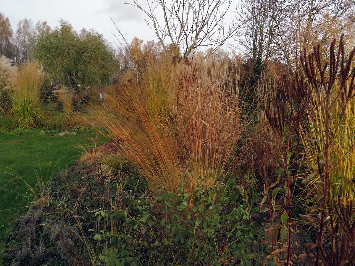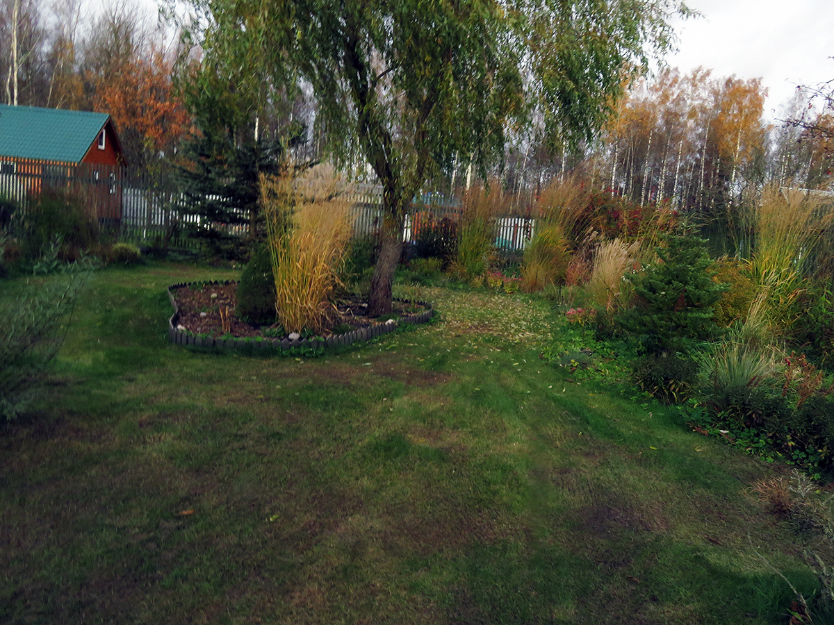 На первом фото видна слева тростниковая молиния «лаймового» цвета. Вообще молинии в нашем регионе обычно не окрашиваются, может, для них просто климат не тот. Во всяком случае, первые у меня появились в 2014-2015 году, и такого осеннего окраса у них я еще не видела. Обычно по осени их листва просто жухнет, а длинные цветоносы с метелками просто обесцвечиваются.