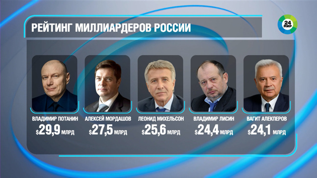 Возглавляет список президент «Норникеля Владимир Потанин. Его состояние приближается к 30 миллиардам долларов. Отстают от него основатель «Северстали Алексей Мордашов и совладелец НОВАТЭКа Леонид Михельсон.