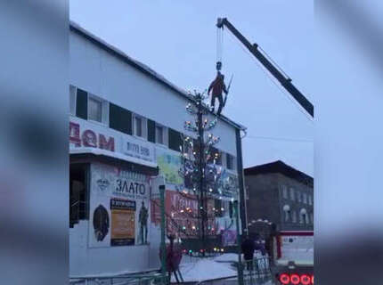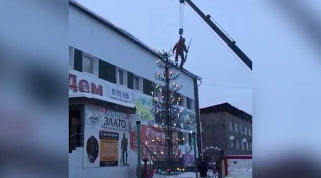 В Якутии висящий на крюке подъемного крана альпинист украсил елку и попал на видео