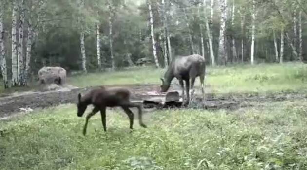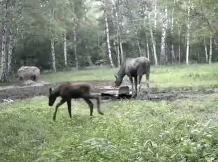 Фотоловушка российского заповедника запечатлела трапезу лосихи с детенышами