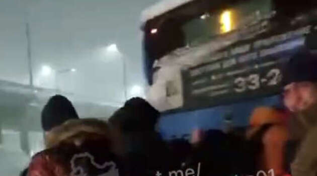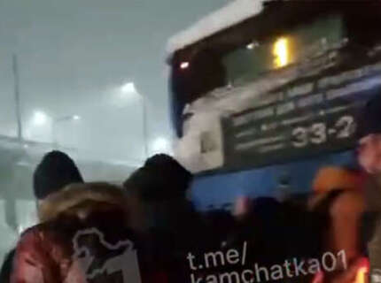 На Камчатке на видео сняли, как десятки мужчин выталкивали из сугроба автобус