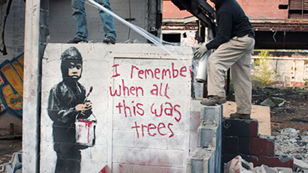 Две фрески, созданные британским уличным художником Бэнкси в Детройте и Вифлиеме, будут выставлены на аукцион Julien’s в Лос-Анджелесе 30 сентября. Как сообщает The Independent, работы могут уйти с молотка за миллион долларов. Граффити I Remember When All This Was Trees было нарисовано на одном из зданий в Детройте в 2010 году. На рисунке изображен ребенок, держащий ведро с красной краской. Он стоит у обшарпанной стены, на которой и написано название картины. Необычным элементом рисунка стали отпечатки пальцев Бэнкси, личность которого не установлена. Фреска оценивается в 200-400 тысяч долларов. Как сообщается на сайте аукционного дома, вторая работа 2007 года под названием Donkey Documents была обнаружена на границе Израиля и Западного берега реки Иордан, на ней изображен вооруженный солдат, проверяющий документы у осла. По словам представителей аукционного дома, граффити размером два на три метра — «самое крупное и значимое произведение Бэнкси, созданное им во время визита в Израиль». Перед тем как фреска, которая оценивается в 400-600 тысяч долларов, будет выставлена на торги, ее можно будет увидеть на выставке в Лондоне. Место и время показа пока не сообщается. Граффити Бэнкси стали появляться на улицах с начала 1990-х годов. В настоящее время работы художника оцениваются в миллионы долларов и значительно увеличивают стоимость недвижимости, на которых размещены, поэтому их порча квалифицируется как вандализм. «Фирменным стилем» Бэнкси считается использование трафаретов. Про жизнь анонимного художника снят фильм «Выход через сувенирную лавку».
