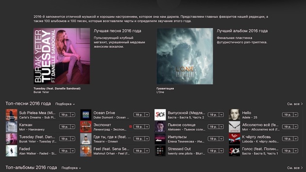 Компания Apple подвела итоги 2016 года и объявила самые кассовые и популярные релизы Apple Music и iTunes, в том числе и в России. Самым продаваемым в российском сегменте Apple Music и iTunes в 2016 году стал трек Sub Pielea Mea молдавский музыкальной группы Carla's Dreams. Также в тройку лидеров вошли сингл «Капкан» Мота из сольного альбома под названием «Наизнанку» и трек голландского диджея турецкого происхождения Бурака Йетера Tuesday. Кроме того, десятку вошли «Экспонат» Ленинграда, «Выпускной (Медлячок)» Басты и «Где ты, где я» Тимати и Егора Крида. Самым кассовым фильмом iTunes стал «Стажер» с Робертом Де Ниро, за ним следует мультик «Зверополис», затем «Экипаж», «Выживший» и « Иллюзия обмана 2». Редакция iTunes при этом выбрала следующие фильмы: Зверополис Дедпул Игра на понижение Экипаж Отряд самоубийц Варкрафт Книга Джунглей (2016) Стартрек. Бесконечность Первый Мститель: Противостояние Омерзительная восьмерка