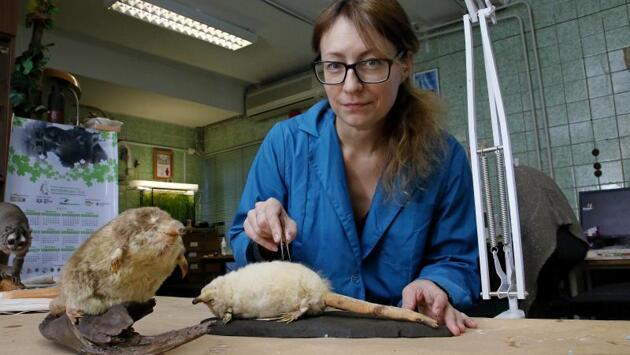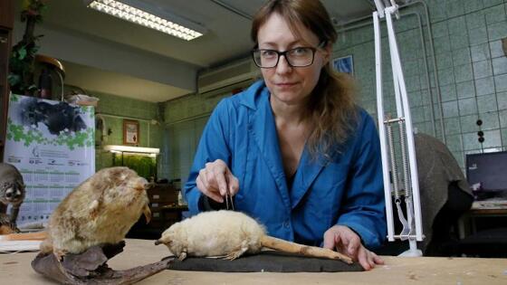 Запасники самой известной в России таксидермической мастерской столичного Дарвиновского музея скрывали настоящее научное чудо. Шкура редкого зверя — русской выхухоли — 43 года пролежала в спирте, прежде чем стать частью экспозиции. Зачем нужно было выжидать четыре десятилетия и где теперь будет обитать выхухоль вместе со своим собратом, выяснила «ВМ».Комната в подвалах Дарвиновского музея пропитана специфическим запахом клея. На столах, похожих на операционные, разложены пинцеты, кисточки , маникюрные ножницы. Повсюду чучела животных — бок о бок мирно уживаются те, кто в природе был хищником и его добычей. Вот, к примеру, чучело петуха, а рядом — волка. Такая шутка судьбы. Перед таксидермистами стоят сразу две непростые задачи — экспонаты должны сохраниться на много лет и остаться максимально приближенными к оригиналу. У каждого чучела — своя жизнь и своя история. А бывает так, что своего выставочного часа ждут десятки лет. Так, например, было с этой русской выхухолью, которая теперь робко сидит на подставке из дубовой коры. — Выхухоль — очень редкий, реликтовый вид, современник мамонтов, — рассказывает хранитель коллекции и ведущий научный сотрудник Дарвиновского музея Игорь Фадеев. — Каждый такой зверек, выполненный с высочайшей точностью и вниманием к деталям, является ценным приобретением для любого естественно-научного музея. Это сейчас она смотри на нас глазами-бусинками, что так малы, что их было бы вообще не видно, если бы не белые пятна вокруг. А до этого заспиртованная шкурка русской выхухоли была привезена из Клязьминского заказника Ивановской области в 1974 году. Таксидермисты рассказывают, что это самый простой способ сохранения материала, но не очень надежный — шкурка дубеет и плохо тянется. Выкинуть материал не поднималась рука, ведь зверь крайне редкий. Поэтому шкурка была оставлена до лучших времен. — Безусловно, получившийся экспонат после больше года работы — это достижение наших мастеров-таксидермистов, — отмечает Фадеев. — Потому что они не переставая учатся новым технологиям и применяют современные материалы. В результате из шкурки, пролежавшей в спирте 43 года, получился замечательный зверек, которого можно будет увидеть летом на большой выставке, посвященной 110-летию музея «Десять лет второго века». А совсем скоро, 15 февраля, на выставке «Обыкновенные необыкновенные звери» можно будет увидеть абсолютно уникальную (единственную в мире!) выхухоль альбиноса, впервые выставляемую в Дарвиновском музее. — Согласно архивным музейным ведомостям мы приняли ее в дар от коллег из Биологического музея МГУ в середине прошлого века, — поясняет Игорь Фадеев. — Но прежде никогда не выставляли, ведь выхухоль крайне редкий зверь, и представить ее широкой публике означало бы намеренно ввести в заблуждение тех, кто вовсе никогда не видел этого зверя. Некоторые посетители могли решить, что это обыкновенный окрас. А на самом деле животные-альбиносы встречаются в природе в соотношении 1 к 10 тысячам особей. И большая удача, что эта редкая выхухоль, чей вид настолько древний, что является современником мамонта, еще может послужить науке. ЗВЕРЬ ИСКОННО РУССКИЙ Выхухоль примечательна уже тем, что это единственное животное, чье научное название содержит в себе слово «русская». Это довольно крупный зверь по сравнению 