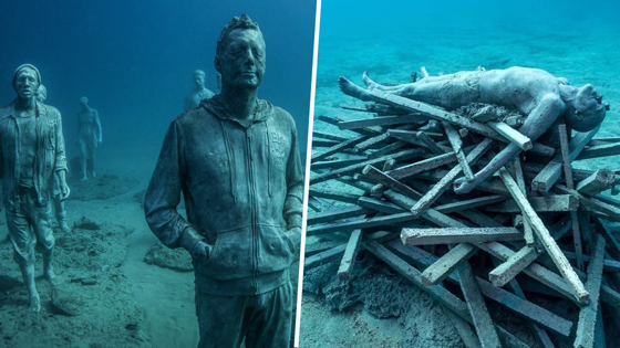 Современный мир вряд ли испытывает нехватку музеев, но парк подводных скульптур вблизи острова Лансароте на Канарах действительно поражает. Правда, чтобы полюбоваться красотой придется обзавестись специальным оборудованием, ведь размещен музей на глубине в 14 метров. Автором уникального подводного проекта "Атлантико" является скульптор Джейсон Тейлор, который своей работой хотел продемонстрировать связь искусства и природы. На просторах размещенной под водой площадки скульптуры сгруппированы по трем ключевым темам, а именно изменение мирового климата, охрана природы, а также миграция людей. Крупнейшая инсталляция носит наименование "Точка невозврата" и демонстрирует порядка 40 скульптур, движущихся в сторону высокого барьера. Объекты призваны показать современное общество, например, кто-то идет делая селфи или уткнувшись в собственный смартфон, а кто-то и вовсе просто закрыл глаза. Фактически Тейлор делает акцент на проблеме глобального изменения климата, ведущей к пункту, где нет возврата к тому, что было. Имеется на дне водоема и двое бизнесменов на качели, напоминающей нефтяную вышку. Так автор работ показал, что крупным корпорациям плевать на климат, также под водой оказалась шлюпка с затонувшими мигрантами. Также здесь можно найти объект "Человеческий круговорот", насчитывающий около 200 скульптур.
