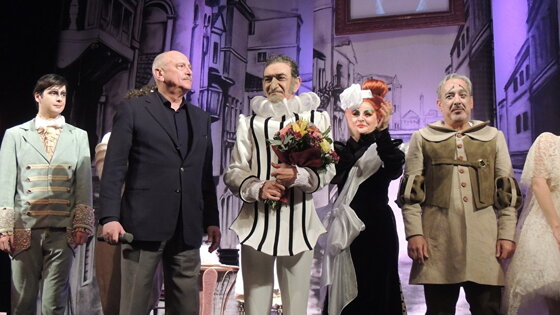 Кямаля Алиева, Sputnik Азербайджан До сих пор не верится, что народному артисту Азербайджана, известному актеру театра и кино, всенародному любимцу Мабуду Магеррамову исполнилось 60 лет. Да и сам юбиляр в это не верит. Поклонники его творчества помнят все его роли и каждый раз с нетерпением ждут от него новых образов в театре и кино. Годы не изменили юбиляра, он находится в прекрасной физической и творческой форме и собирается продолжать радовать своих верных зрителей. Азербайджанский государственный русский драматический театр подарил незабываемый праздник народному артисту. К его юбилею народный артист Александр Шаровский поставил спектакль по пьесе Карло Гольдони "Сеньор Тодеро-хулиган". Как и положено актеру, Магеррамов отпраздновал знаменательную дату на сцене, чтобы обрадовать своих верных зрителей профессиональной игрой и доказать, что возраст для него не помеха. Празднично разодетые дамы, солидные мужчины, милые улыбки, добрые шутки, искренние аплодисменты, хорошее настроение и море цветов — всего этого было в этот вечер без ограничений. Все билеты на юбилейный спектакль были распроданы за несколько дней до премьеры. В зале не было ни одного свободного места. Среди зрителей было также огромное количество гостей из-за рубежа, которые специально прилетели в Баку ради юбилея актера. Действие спектакля происходит в далеком прошлом в Венеции, но режиссер немного осовременил пьесу, что выразилось в костюмах, декорациях и манере общения актеров, которые больше напоминали кукол на сцене. В постановке были задействованы ведущие актеры театра. Сюжет вели Арлекин (Эльшад Муртузов) и Коломбина (Милана Соколенко). В постановке рассказывалась история синьора Тодеро (Мабуд Магеррамов), который по-хозяйски распоряжается судьбами близких людей и наслаждается своей безграничной властью в доме. Он настоящий скупердяй, который экономит на всем, даже на своих родных. Его невестка Марколина (заслуженная артистка Мелек Абас-заде) при помощи синьоры Фортунаты (народная артистка Наталья Шаровская) хочет выдать свою дочь Занетту (Мария Дубовицкая) замуж за Менегетто (Олег Амирбеков). Но ее супругу Пеллегрину (заслуженный артист Фуад Османов) не удается уговорить отца, который уже решил выдать дочь за сына своего работника Дезидерио (Ягуб Зейналов) Николетто (Ибрагим Чингиз). Также в спектакле задействованы Ольга Арсеньтьева (служанка Чечилия) и Надыр Абдурагимбеков (слуга Грегорио). Герои без устали думают, как им выйти из этой ситуации? И решают, что изменить синьора Тодеро способна только любовь. С помощью синьоры Фортунаты, которая влюбляет в себя главного героя, им удается получить согласие на брак Занетты с Менегретто. Синьор Тодеро в конце не может сдержать слез, потому что понимает, что самое главное в жизни — это семья. Эта постановка раскрыла многих актеров для зрителей с неизвестной их стороны. В спектакле были использованы арии из оперных шедевров, которые мастерски исполнял Фуад Османов, выражая с помощью них свои чувства. Также со сцены прозвучали отрывки из разных известных поэм, которые озвучивал Олег Амирбеков. Каждый из актеров был в этот вечер на высоте, но особо среди них выделялся юбиляр — Мабуд Магеррамов, который доказал, что все роли ему подвластны. Получился яркий, красочный музыкальный спектакль. А в этом, конечно 