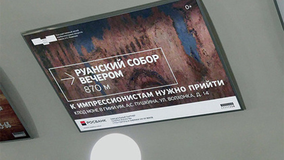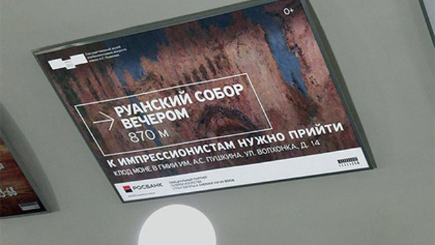 Государственный музей изобразительных искусств (ГМИИ) имени А.С. Пушкина разместил в Москве указатели, ведущие к Руанскому собору, Бульвару капуцинок и Оперному проезду. Об этом сообщает портал «Мослента» со ссылкой на пресс-службу учреждения. Акция призвана привлечь внимание к постоянной экспозиции импрессионистов и постимпрессионистов. «ГМИИ им. А.С. Пушкина впервые запускает креативную кампанию, посвященную не выставке-блокбастеру, а постоянной экспозиции», — заявили представители музея. Транспаранты с репродукциями знаменитых полотен и слоганом «К импрессионистам нужно прийти» появились на центральных улицах города — Новом Арбате, Ленинском проспекте, Никитском и Чистопрудном бульварах, Крымском валу. На плакатах также указано точное расстояние до музея. В реализации проекта участвовал «Росбанк». В постоянную экспозицию ГМИИ Пушкина входят картины Моне, Ренуара, ван Гога, Сезанна, Матисса, Пикассо, Дерена. Эта коллекция сопоставима по размерам с собраниями Музея д’Орсэ и Метрополитен-музея.