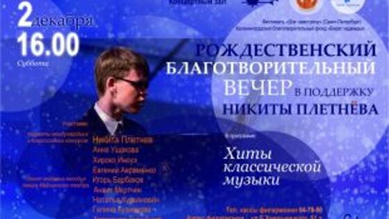 В Калининграде при поддержке благотворительного фонда «Берег надежды» пройдет концерт в поддержку незрячего 16-летнего пианиста из Пионерского Никиты Плетнева. Все собранные от продажи билетов средства будут направлены на покупку специального оборудования для юного музыканта. «Никита ослеп в раннем детстве, врачи не смогли спасти зрение мальчика. Но у Никиты открылся талант – он на слух научился играть на фортепиано. Более того, не просто играть, оказалось, что у него самый настоящий дар, который подтвердили профессиональные музыканты», - рассказали в Фонде. У Никиты нет самого необходимого слепому человеку оборудования - дисплея Брайля, который я позволяет слабовидящему или незрячему человеку работать с компьютером и делать очень много других вещей. В концерте примут участие лучшие музыканты Калининграда, Хироко Иноуэ, Анна Ушакова, Евгений Авраменко, Наталья Курьянович, Галина Кузнецова, Александр Дудницкий, Виктория Бобкова и вместе с ними на сцене будет выступать Никита Плетнев. Прозвучат произведения Рахманинова, Моцарта, Шопена, Чайковского.
