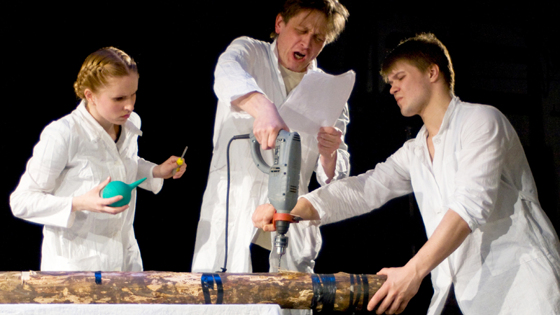 В последний день так называемой весны театральный сезон в Центральном доме актера завершил питерский спектакль «Записки провинциального врача» по произведению... не Михаила Булгакова, а современного драматурга Елены Исаевой, впрочем, с более булгаковским названием (у Исаевой пьеса - Doc.тор). Постановка Андрея Корионова не первая, но одна из самых удачных и неудивительно, что спектакль участвовал во множестве фестивалей и с успехом продолжает идти в Санкт-Петербурге (премьера в «Театре За Черной речкой» состоялась в 2009 году). Тепло встретили хирургический вербатим, в присутствии самой Исаевой, и в Москве. Пьеса Елены Исаевой неспроста называется Doc.тор, это документальный театр. Собственно, пьеса была поставлена в 2005 году в «вербатим-центре» Театре.doc, как и ряд других произведений автора. Основой пьесы являются страшные истории из жизни хирурга, сначала молодого, потом более опытного. Те же, в общем-то, истории, что и у Булгакова, особенно это касается прямо упомянутого в пьесе рассказа «Полотенце с петухом», но с некоторыми особенностями постсоветского (а не до) врачевания. Если предреволюционный герой Михаила Афанасьевича, прибыв на место, отмечает, какой в деревенской больнице прелестный инструментарий, то хирург Исаевой то и дело сталкивается с нехваткой самого необходимого. Где-то посередине находится еще один молодой хирург, герой Василия Ливанова из «Коллег». В 2009 году за текст взялся Андрей Корионов, тогда только выпустившийся из СПГАТИ. Постановка стала лучшим спектаклем режиссерской лаборатории ON. Театр, места, где при поддержке городского комитета по культуре и Санкт-Петербургского академического театра имени Ленсовета как раз и дают слово молодым режиссерам, авторам и актерам. Корионов очень грамотно вовлекает зрителя и технично держит его до самого конца. Сначала аудитория видит на сцене хмурого человека в черной майке, иногда отхлебывающего из бутылки. При этом некий техник что-то продолжает настраивать (спектакль как будто еще не начался) и в один прекрасный момент человек в майке бросается ему помочь и падает, сраженный ударом тока. Девушка, перед этим извинявшаяся за технические проблемы, зовет на сцену врача - вполне возможно, что где-то ей и удавалось дозваться настоящего эскулапа, но в Доме актера на Арбате на сцену вышел, конечно, только заслуженный артист России Василий Реутов, который и играет главного врача этой постановки. Играет, вне всяких сомнений, очень хорошо, артист БДТ и других питерских театров - это крепкая основа всей постановки. Кроме врача Реутова в спектакле задействованы всего два человека - молодые парень с девушкой, которые играют все прочие роли, от различных медсестер-анестезиологов до полицейских. Но еще одну важную роль играет деревянное полено - универсальный пациент. Его сначала рожает женщина под Брянском, потом его всячески оперируют, промывая разрезанный кишечник, то удаляя язву. Полено пилят, кромсают, сверлят, вставляют разные инструменты, таскают туда-сюда и даже дают прикурить после особо сложной операции. В самом конце с помощью набора вонзенных в дерево инструментов и гирлянды деревянный пациент становится даже елочкой. Получается вербатим-буратино, но, помимо того, что полено отлично дополняет актерский ансамбль, оно довольно точно определяет, кто мы все на этом све