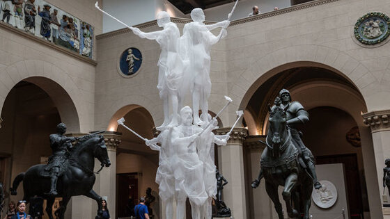 Андрей Блохин и Георгий Кузнецов, образующие Recycle Group, – самые успешные из наших молодых художников. В свои тридцать они имеют завидный послужной список: выставлялись в разных странах, получили премию Кандинского, галерея «Триумф» дважды показывала их проекты в Венеции во время биеннале, а в этом году им отдана там часть павильона России. Ну а теперь выставка в Пушкинском музее, что, конечно, и почетно, и рискованно. Потому что хотя выставлены работы современных художников и в залах со слепками, но в стенах, где демонстрируется и демонстрировалось искусство самого высокого класса, в том числе и великое, так что внедренным авторам снисхождения не полагается. Проект Homo Virtualis заключается в размещении 16 объектов группы в залах музея и на лестнице перед парадным входом. Часть из них – скульптуры из пластика, часть – сочинения в дополненной реальности, которые можно увидеть на экранах смартфонов, предварительно скачав приложение Recycle Group. Сразу скажем, что не у каждого это получится и дело не только в умениях пользователей, а в качестве музейного интернета. Но главная проблема здесь, прямо скажем, не техническая, а эстетическая. Она общая для всех художников, пользующихся новыми технологиями, работающих в технике (думаю, можно так сказать) дополненной реальности: язык освоен, но не настолько, чтобы сочинять на нем. Так что появляющиеся в результате наводки мобильного телефона на стелы со схемами сетчатые виртуальные фигуры хотя и изображают своими формами и позами классическую скульптуру, никаких сложных чувств не вызывают. Как и виртуальные, не видимые без смартфона, люди при входе в здание, изображающие очередь. Впрочем, консервативную музейную публику, не гонявшуюся за покемонами, представители дополненной реальности могут впечатлять уже фактом своего проявления. Но нужна ли художественному музею, где на картинах уже создана идеальная реальность, какая-то еще иллюзорная действительность – пока вопрос. И с его решением хорошо бы не спешить, новые технологии появляются и исчезают значительно быстрее, чем свежие художественные идеи. Ну и хочется, конечно, где-то спрятаться от повседневной повинности смотреть на экран. В материальном же искусстве Блохин и Кузнецов работают бесспорно интереснее, чем в неосязаемом. В Пушкинском музее они показывают новые и уже виденные работы из полиуретана и пластиковой сетки, которые отлично вписались в постоянную экспозицию Итальянского дворика, египетского, греческого и средневекового залов. Скульптура во все времена воспроизводила человеческие формы, а Recycle Group эту традицию прилежно продолжает, вступая в диалог со старым искусством или эксплуатируя его. Их скульптуры в меру новы по материалу и актуальны по сюжетам, но часто банальны пластически, спасает Recycle Group юмор, его он явно предпочитает пафосу. Пластиковый барельеф «Лаокоон» вполне реалистично изображает человека, опутанного обрывками кабеля, скульптурная группа «Селфи-башня» составлена из сетчатых рыцарей и дев с палками-подставками, а нескольких «Просветителей», копирующих руинированные античные статуи, с виду отличает от оригинала только печать со знаком популярной соцсети. «Саркофаги» в форме уличного контейнера для мусора напоминают о ранних работах группы, теряющей по мере роста популярности обворожительную легкость сво
