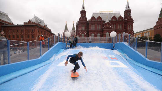 К 870-летию Москвы в самом центре города, у стен Кремля, установили бассейны для вейкбординга — катания на доске по воде. Первыми вейк-парк протестировали профессиональные спортсмены. Со следующей недели посетить водный аттракцион смогут все желающие. Рядом, на Манежной площади, оборудовали площадку с «искусственной волной». Оба бассейна будут работать до 9 октября.