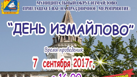 Праздник ко Дню района пройдет 7 сентября по адресу: Измайловский бульвар, напротив дома 41 (Театр мимики и жеста). Вход свободный. Участниками концертной программы станут взрослые и дети. В рамках мероприятия «День Измайлово» пройдет праздничный концерт, участниками которого станут артисты и творческие коллективы города Москвы. Будет подготовлена анимационная программа для юных гостей. Ожидается множество мастер-классов, в которых поучаствуют все желающие. Ведущий праздника проведет конкурсы для зрителей. Как обещают организаторы – скучно не будет никому. Начало мероприятия в 16:00. Всех с нетерпением будут ждать на этом веселом празднике, где соберутся соседи и друзья.