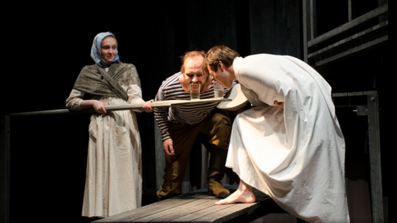 Очередной спектакль, зародившийся в нише «Пробы и ошибки», добрался до премьеры и вошел в репертуар театра. Композицию по рассказам Юрия Казакова «Проклятый Север» составила актриса «Мастерской» Полина Айрапетова. Постановщица также играет в спектакле три роли; впрочем, тут каждый исполнитель занят в нескольких ролях, ведь «Проклятый Север» - мозаика из нескольких сюжетов. Фоменки взялись за те рассказы Казакова, что были написаны в результате его многочисленных поездок на Белое море. Писатель часто ездил в край белых ночей, жил в домах поморов, был очарован особым строем их речи, да и самими поморами – самодостаточными людьми, обитающими на краю земли, вне большого социума. Автор декораций к спектаклю Константин Лебедев замечательно «укрупнил» персонажей-жителей прибрежной деревни, сделав ниже, теснее «помещения» поморских жилищ. Люди тут вынуждены пригибаться, проходя сквозь невидимую дверь. А в рыболовной сети, разложенной на сцене, запутались маленькие бумажные кораблики. Ветеринар Николай в исполнении Андрея Миххалева, бакенщик Егор в исполнении Анатолия Анциферова кажутся великанами. Люди они простые и цельные. Живут, не мудрствуя лукаво. Тем и приводят в какое-то гипнотическое восхищение приезжих с «большой земли» - богемных москвичей, жаждущих свежих впечатлений. Учительница Соня, писатель Кудрявцев, музыкант Алеша, художник Агеев – все они приезжают на Север, чтобы отдохнуть от столичного шума и «припасть к истокам». Все смутно надеются получить здесь вдохновение от видов моря, тумана, северного сияния, но главным впечатлением в каждом случае становятся люди. Дети суровых мест, поморы глядят на нервных москвичей с иронией и некоторой жалостью. Восторженные интеллигенты кажутся детьми рядом с гордыми, степенными жителями рыболовецких деревень. В спектакле «Мастерской» заняты семь молодых актеров театра. На сцене – те же исполнители, что играют в роскошном, масштабном спектакле «Капитан Фракасс». Например, красавицы Полина Айрапетова и Мария Большова, а также Андрей Миххалев в «Проклятом Севере» предстают в какой-то момент старухами в огромных северных валенках и платках, повязанных над глазами... Вообще, «Север» - замечательный образчик искусства актерского перевоплощения.