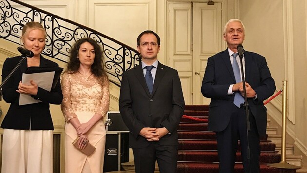 Во встрече приняли участие губернатор Псковской области Андрей Турчак и руководитель Центра всемирного наследия и международного сотрудничества, Российского научно-исследовательского института культурного и природного наследия имени Д.С.Лихачева Надежда Филатова. "То, что Пскова до сих пор нет в списке ЮНЕСКО- это несправедливо, мы активизируем эту работу, надеемся, через полтора года мы увидим звездочку ЮНЕСКО и рядом с городом Псков на карте", - отметил Министр культуры РФ Владимир Мединский. 15 сентября состоялось официальное открытие выставки "Живопись иглой" мастерской "Прикосновение" г-ном Мединским, Послом РФ во Франции Александром Орловым и президентом центра кинофестивалей и международных программ Татьяной Шумовой в новом Российском Духовно-Культурном центре в Париже. На экспозиции была представлена коллекция икон ручной работы из бисера и драгоценных камней. "Для работы над каждой из них используются исключительно природные материалы. Запрещено в канонах православия использовать синтетику, поэтому любая из икон может занять свое достойное место в любом храме или монастыре",- рассказала руководитель мастерской Наталья Горковенко. В ответ на вопрос о предстоящей встрече с министром культуры Франции Франсуаз Ниссен и о приоритетных темах этой встречи, Мединский ответил, что несмотря ни на какие международные сложности и расхождения в политических и культурных вопросах, культурные обмены России и Франции всегда были и продолжают находиться на хорошем уровне. "Мы участвуем в театральных фестивалях...Мы по-прежнему поддерживаем фестиваль российского кино, который проходит как в Париже, так и на севере Франции, фестиваль русской культуры в Каннах и много других проектов. Только сейчас в Париже, не считая этой, еще две большие выставки. Одну их них открывал президент Франции вместе с Владимиром Владимировичем". Министр Культуры на открытии выставки "Живопись иглой" в Российском Духовно-Культурном центре Вечером того же дня Министр культуры торжественно открыл еще одну выставку, теперь уже в резиденции Посла Александра Орлова. Выставка эта носит название "Дипломатические подарки от Петра Великого до наших дней" и организована в рамках днях европейского культурного наследия. Она разделена на две части. Первая-это реконструкция уникального янтарного кабинета, подарка прусского монарха Фридриха Вильгельма I Петру I, над которым 10 лет старались 50 мастеров. Янтарю здесь 50 млн лет, и это самый дорогой янтарь на свете, тот самый, из которого был сделан оригинал. Анжелика Калинина и Анатолий Стриго в Янтарной комнате Вторая часть экспозиции посвящена дипломатическим подаркам: серии эксклюзивных книг, предназначенных для вручения главам иностранных государств и украшенных драгоценными камнями, росписью золотом, эмалью – бесценные произведения искусства, достойные быть включенными в фонды крупнейших мировых музеев. Идея и воплощения проекта принадлежит российским меценатам Анатолию Стриго и Анжелике Калининой, которая подчеркнула, что всё делается вручную и книги собираются по листочку.