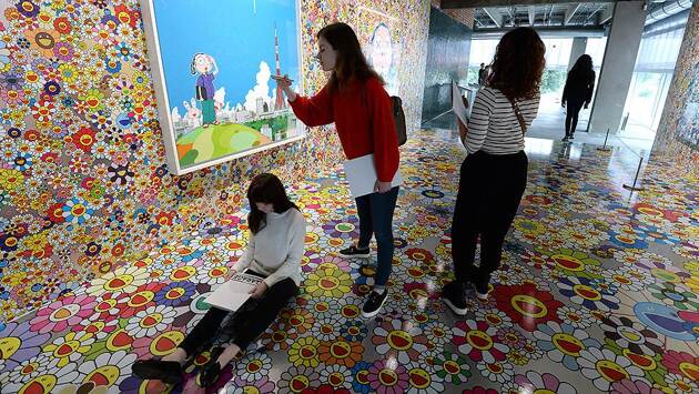 Выставка охватывает все творчество Мураками — от работ начала 1990-х годов, периода его учебы в Токийском университете искусств, до произведений, созданных прямо в «Гараже» специально для нынешней экспозиции. И при этом привлекает японские расписанные свитки и цветные ксилографии XVIII–XIX веков из собрания ГМИИ им. А. С. Пушкина, которые, несмотря на свой скромный по сравнению с полотнами Мураками формат, крепко держат удар рядом с технически изощренной живописью. Кроме того, эта выставка пытается заинтересовать и самых непредвзятых зрителей: на ней есть даже детская горка, спускающаяся из пасти огромного скульптурного Мистера Доба. То, что в европейской культуре воспринимается как инфантильность, в японской имеет вполне взрослые черты. Фанатично увлеченных мангой и аниме там называют отаку, и Мураками — яркий представитель этой культуры. Но благодаря классическому художественному образованию весь этот анимешный мир в его исполнении приобрел филигранную пластику.