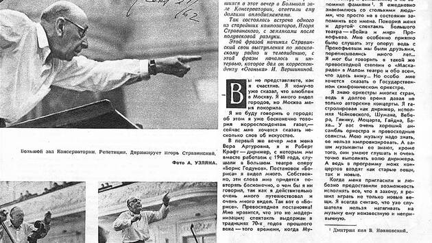 55 лет назад «Огонек» опубликовал интервью с композитором Игорем Стравинским, который спустя полвека после отъезда из России вернулся на родину с гастролями 55 лет назад "Огонек" опубликовал интервью с композитором Игорем Стравинским, который спустя полвека после отъезда из России вернулся на родину с гастролями. В Москве прославленный музыкант дал серию концертов в консерватории. "Более 50 лет я не был на родине,-- рассказывал в интервью журналу Игорь Федорович.-- Мы с семьей уехали в 1910 году из-за болезни жены. У нее был туберкулез, врачи велели сменить климат, и мы поселились на Женевском озере. Но долго оставаться там не могли. У меня была большая семья: два сына и две дочери,-- жизнь там очень дорога, и мы перебрались во Францию. Там я встретился с Дягилевым, для которого писал балеты еще в Петербурге, и мы вновь стали вместе работать. К этому времени началась и моя гастрольная дирижерская деятельность". "Я писал балеты и для труппы Иды Рубинштейн,-- продолжал свой рассказ Стравинский.-- Для нее я написал балет памяти Чайковского "Поцелуй феи". С Чайковским у меня связано одно из самых дорогих воспоминаний. Я видел его один-единственный раз в жизни. Это было в Мариинском театре на торжественном спектакле "Руслан и Людмила", посвященном 50-летию оперы. Фарлафа пел мой отец". "В 30-х годах я много выступал как пианист,-- продолжал Стравинский.-- В эти же годы я написал первые свои книги. Сейчас уже пять издано. Последние три -- это диалоги между мной и Робертом Крафтом -- дирижером, с которым мы работаем с 1948 года. Их тема не только музыка, но и живопись, театр, литература". "В свободное от гастролей время (а гастролирую я добрых 6 месяцев в году) я много читаю,-- добавлял 80-летний Стравинский.-- В моей библиотеке 6 тысяч книг, и среди них немало русских. Это и неудивительно, русский был и остается моим родным языком. По-русски я пишу письма сыновьям. Они не живут со мной. Святослав -- профессор по классу фортепьяно в университете близ Чикаго, Федор -- художник, живет в Швейцарии. Вот надеюсь на обратном пути его повидать. Ведь отсюда я еду с концертами в Италию, затем в Венесуэлу, Канаду. И после этого в Лос-Анджелес, где я сейчас живу, где меня ждет мой рояль". Я видел Чайковского один-единственный раз в жизни. Это было в Мариинском театре на торжественном спектакле "Руслан и Людмила", посвященном 50-летию оперы. Фарлафа пел мой отец