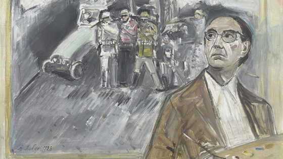 Автопортрет на фоне картины «Октябрь» 1928 года. 1978. Холст, масло. Фрагмент. Костромской государственный историко-архитектурный и художественный музей-заповедник. © Ольга Бескина-Лабас