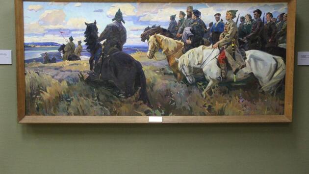 «Даешь революцию в искусстве» – именно так назвали организаторы масштабную экспозицию в залах Картинной галереи на Партизанском Проспекте, 12. Открывшаяся вечером 3 ноября выставка включает около 60 работ, объединенных темой революции во всех ее видах и проявлениях. Первая часть экспозиции посвящена революции в искусстве и работам постреволюционного модернизма. Следующий зал посвящен доминировавшей в искусстве соцреализма революционной тематике, как таковой. И, наконец – значительная часть экспозиции отведена Лениниане, как главной составляющей программы монументальной пропаганды эпохи социализма. Работы Николая Жукова, Исаака Бродского, Николая Томского относятся к числу удивительных по качеству изображения произведений искусства, по понятным причинам не экспонировавшихся последние четверть века. Спасибо нынешней круглой революционной дате, предоставившей достойный повод вытащить эти работы из запасников. Не менее интересным выглядит раздел выставки, составленный из работ художников-модернистов из окружения Давида Бурлюка и Владимира Лебедева. Такие представители владивостокских авангардистов , творивших на рубеже веков, как В. Пановский, В. Баталов, В. Пальмов, П. Любарский и И. Видин дают любопытную картину художественной жизни Владивостока революционной эпохи. Огромный пласт художественной жизни той поры составили монументальные картины эпохи социалистического реализма. Работы Кирилла Шебеко, Валентина Чеботарева, Василия Бочанцева, Василия Доронина блестяще воплотили в живописи историко-революционную тему. Эти мастера сумели благополучно избежать живописных клише, несмотря на бесконечное повторение однотипных сюжетов и революционных персонажей в искусстве соцреализма. Выходя за рамки догм и канонов соцреализма, ведущие живописцы Приморья сохранили многообразие творческих стилей и личное авторское мироощущение.