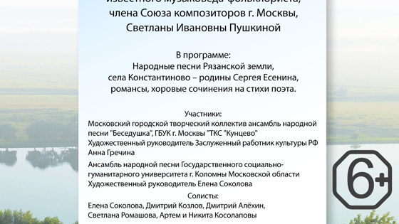Литературно-музыкальную композицию подготовила известный фольклорист, член Союза композиторов России Светлана Пушкина. Концерт, который состоится 19 ноября в доме культуры «Онежский», называется «Народные песни Рязанской земли». Сергей Есенин, день рождения которого отмечали в октябре, как известно, родом с Рязанщины, из села Константиново. На концерте, посвященном его памяти, прозвучат романсы, созданные на стихи этого великого поэта. Их исполнят такие выдающиеся знатоки народной песни, как Дмитрий Козлов, Дмитрий Алехин, Светлана Ромашова, Артемий и Никита Косолаповы, Елена Соколова. Примет участие в концерте также ансамбль народной песни «Беседушка» территориальной клубной системы «Кунцево», художественным руководителем которого является заслуженный работник культуры РФ Анна Гречина. Также на концерте выступит ансамбль народной песни коломенского социально-гуманитаного университета. Начало концерта – в 16:00. Вход свободный. Адрес ДК «Онежский»: ул. Флотская, 25. Юлия Королькова Фото: ТКС «Кунцево»