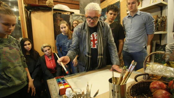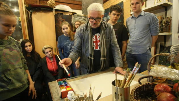 На прошлой неделе в рамках проекта «Вечерней Москвы» «Ассамблея народных ремесел» мы побывали в студии художника Василия Вдовина на Новослободской улице. Ребята смело наносят краску на стекло – плотные мазки гуаши ложатся один к другому, образуя яркие пятна, которые плавно складываются в волшебные образы. - Я очень люблю проводить мастер-классы по монотипии, - рассказывает Василий Вдовин. – Техника хороша тем, что даже у людей, которые с детства не брали в руки кисти, в результате получаются яркие и красивые работы – главное не бояться цвета и дать волю фантазии. Часто бывает так, что на палитре цвета смотрятся очень эффектно, но при переносе на бумагу они блекнут. Принцип монотипии позволяет нам сохранить красоту цвета, смешанного на палитре. Сделать все очень легко технически – на стекло наносится рисунок или просто мазки плотной краски, после чего к стеклу прижимается лист акварельной или пастельной бумаги. Нужно дать краске немного впитаться, после чего снять лист и дать работе высохнуть. Уверен, что результат не разочарует. Сила творчества Недавно я давал большой мастер-класс в институте Лео Бокерии для детей, которые проходят восстановление после операций на сердце. Мы писали с детьми фантазийные сюжеты на тему моря. Ольга Александровна Бокерия, жена Лео Антоновича, рассказала мне, что дети после участия в творческих мастер-классах быстрее восстанавливаются после сложнейших операций и тяжелого наркоза. Сейчас у докторов в институте появилась идея давать мастер-классы больным детям перед операцией, чтобы уменьшить волнение перед этим непростым моментом. Должен сказать, что занятия рисованием положительно влияют на человека. Заниматься ко мне ходят совершенно разные люди – и дети, и взрослые, и люди в возрасте. Прикосновение к краскам, к миру изобразительного искусства всегда вызывает у людей вдохновение и душевный подъем. Люди начинают смотреть на мир другими глазами. Художником может стать каждый? Как правило, художники делятся на два лагеря, относительно вопроса обучения. Одни считают, что человека без таланта надо тотчас же выгонять из-за мольберта и не давать ему прикасаться к краскам, чтобы он их не портил. Я придерживаюсь другого мнения – по моим наблюдениям, талант не всегда просыпается сразу. Я считаю, что научить рисовать и писать картины до определенного уровня можно любого человека без яркого дарования. Как и в любой профессии, в художественном ремесле есть определенные тонкости. До определенного возраста, примерно лет до 12, ребенок в принципе не может понять некоторые особенности рисунка. Как и в любой профессии, в живописи есть свои профессиональные тайны, касающиеся объема и перспективы. Если человек хочет стать художником, то первые занятия по живописи необходимо начинать с академического рисунка. На них объясняются законы ракурса и перспективы, масштабирования и композиции. Это теория и первые практические уроки, которые местами кажутся нудными, но это нужно выучить. Также я считаю, что чтобы рисовать, нужно хоть чуть-чуть разбираться в анатомии. Сначала нужно научиться рисовать все части человека отдельно, научиться разбираться в устройстве человека. Художник должен быть образован. Есть люди, которые не хотят заниматься наукоемкими дисциплинами, а с ходу говорят – я хочу рисовать картины. Для